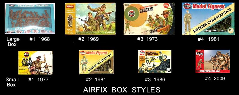 Airfix made their first set in a flat box with a window. Shortly there after they switched to the more commonly seen #2 brown box. In 1977 they introduced the small 1/2 set box.