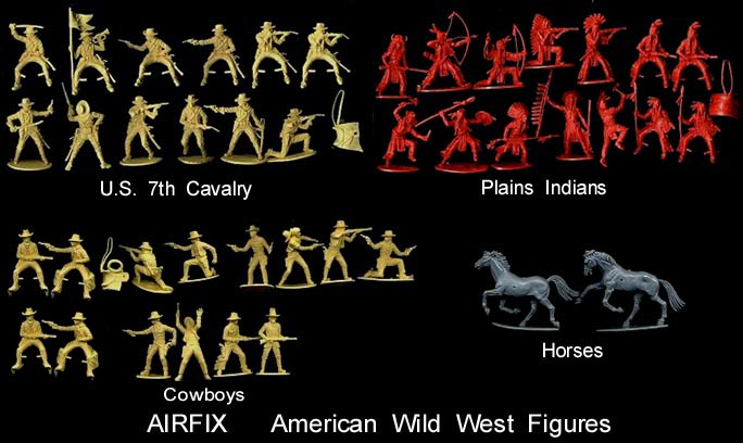 Original Airfix production cavalry and cowboy figures were yellow in color while the Indians were done in a rust redbrown. IMEX made the cavalry in blue in the 1990s. The cowboys have also been made in army green and the Indians in a dull orange and brown. All three sets used the same two horse poses. The mounted cavalryman shooting a rifle was in duplicate as were both of the mounted poses in the Cowboys and Indian sets.
