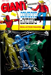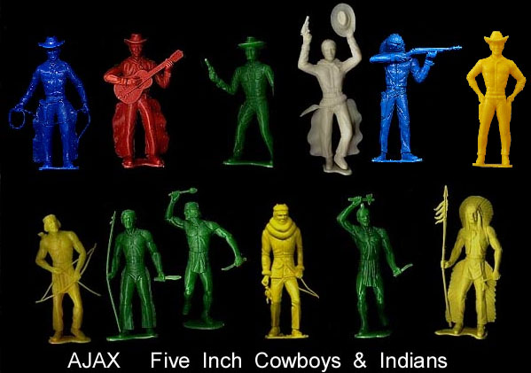 Above are some of the Ajax 5 inch cowboys & Indians. Sealed bag in picture below also has a cowboy shooting a rifle. Perhaps six different cowboys and six different Indians were made but we are not sure. Picture of yellow cowboy top right courtesy of Eric Johns.