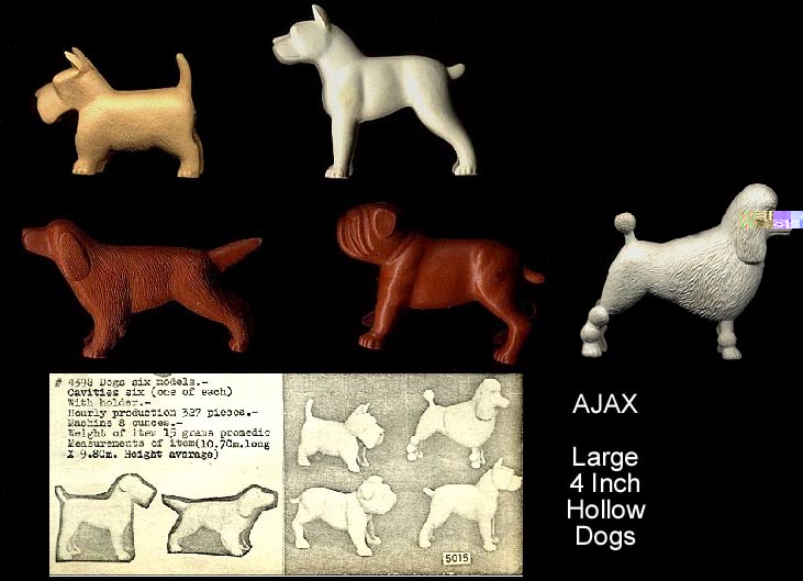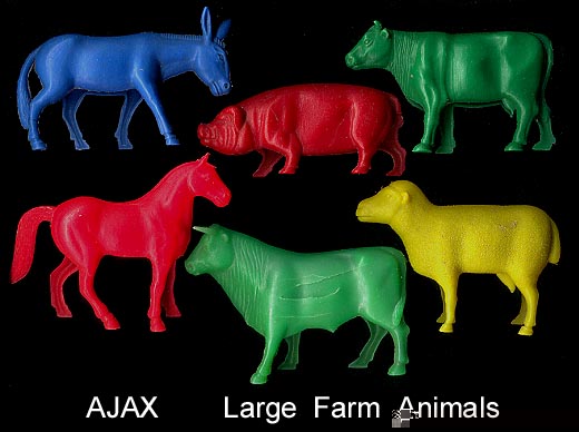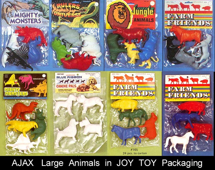 These were made by Ajax and then RECAST in the 1970s & 1980s by Joy Toy (as seen in the Joy Toy catalog pictures shown above generously given to us by Seymour Arenstein's daughter Joy A.Glucksman), and some in the 1990s by Tootsietoy. We do not know how to tell the difference between the Ajax, Joy Toy & Tootsietoy pieces. Most of the loose pieces probably date to the later Joy Toy or Tootsietoy production. Animals seem to have been made in sets of six but we are not certain if that was always true.