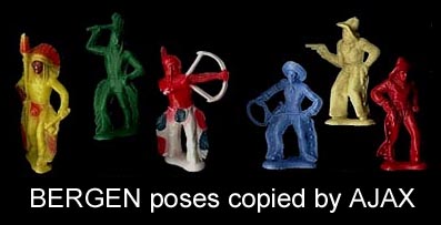 Ajax also made copies of some of the 60mm cowboy & Indian Bergen figures. If a "Bergen" figure does not have a logo then we assume it was sold by Ajax.