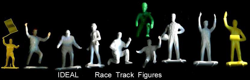 Steombecker made a series of 10 hard plastic race track figures to go with slot car sets. Sold in set 9935 Srombecker International Road Racing set that came with six figures and a guide book where you could order a set of all ten figures for $1. We have seen them in a variety of colors and a few in soft plastic. Thanks to Al Teuscher for the ID and sales information.