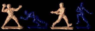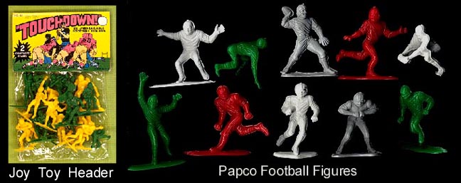 Older 60mm football figures are gray and white and this mold could have been made for Papco by Ajax or Lido. The mold became part of Joy Toys lineup in the 1970s and made in other colors.