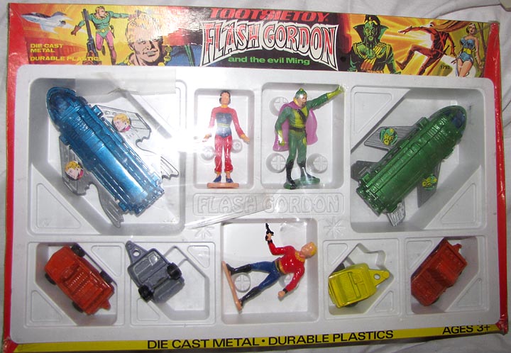 Flash Gorden set three four inch plastic figures + six die cast vehicles. Plastic window broken on box but contents are mint. Late 1970s I think.