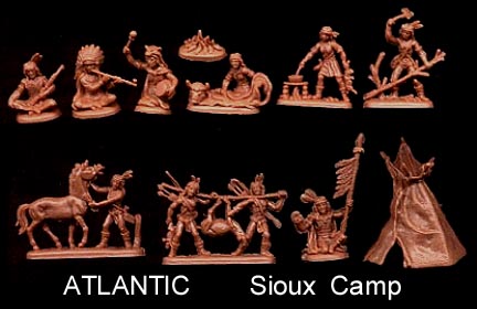 An 11 piece set with 3 foot and four mounted figures + 4 ponies. This set often has "Sitting Bull" in the title which is incorrect as he was a holy man not a warrior. This is a very difficult set to find in 1/32, and even Atlantic did not help by putting Apache Warriors in the last run of Siuox Warriors boxes.