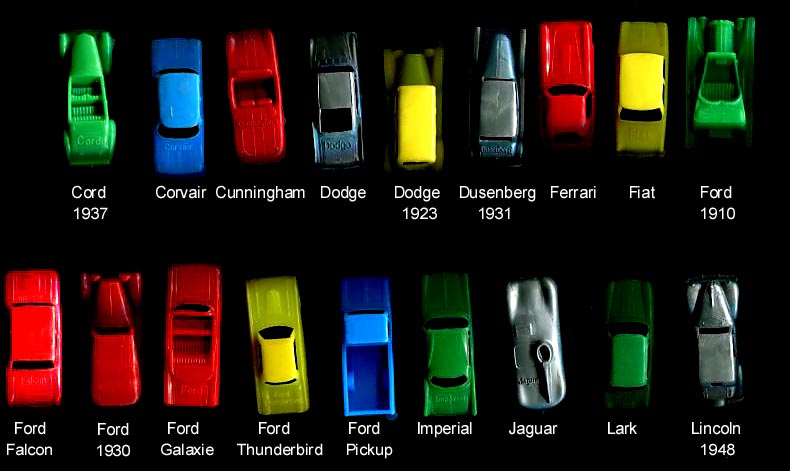 Ford 1910; 1 bright red, 3 green, 2 blue, 2 yellow.