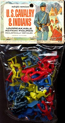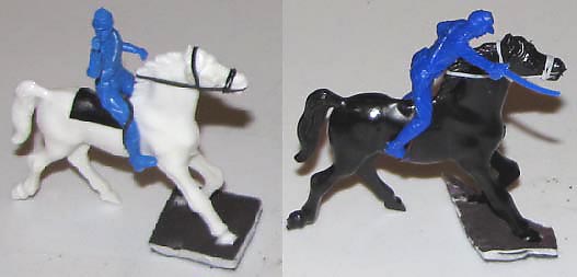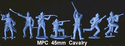 The above photo is of RECAST figures (circa 2003). Most original MPC 45mm Cavalry were made in metallic blue (a few in gray as ACW rebs). Earlier RECASTS (circa 1990)can be found in a stiff light blue plastic.
