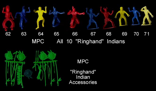 There are two slightly different ring hand Indian accessory sprues. The one with 12 pieces has three arrows and a quiver the one with 10 pieces has one arrow and a feather lance. Otherwise they have the same contents. Most are bright green but we have pictured an example of the harder to find dark green accessories (shield) in between the two sprues as seen above ( and red may also have been used).