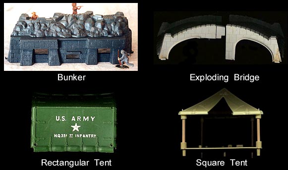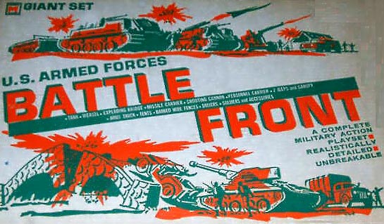 New Marx C0 1990s Battleground commemorative set. Only Marx pieces in the set are the two space cannons (German nebelwefers??). The 60 figures and both pillbox fronts were made from ex MPC molds so we list the set here. Also included are Sherman & Tiger II tanks made by BMC, two balsa gliding airplanes and some generic accessories from perhaps Hong Kong. Comes in a nice box and would make a good Christmas present.