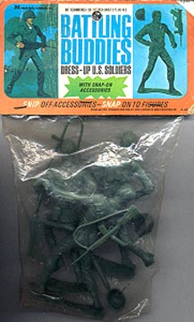 Like their 5-6 inch cowboys and Indians, the MPC large scale GIs came with separate accessories. There are ten poses each with two accessories and they were made in green and metallic blue.