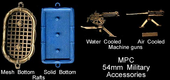 We have seen one source list that there are four different MPC WWII belts. Well as you can see above we have found 11 different belts. The top two were probably made by Marx. It is possible that when MPC made their new better GIs they made a new set of accessories. It is also possible that some of the above accessories were made by Andy Gard who modeled their accessories after MPC. In addition to the belts, you can see three different submachine guns, three different carbines, two different rifles, two different pistols, two different life belts, and three different helmets in the pictures above.