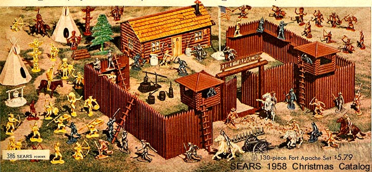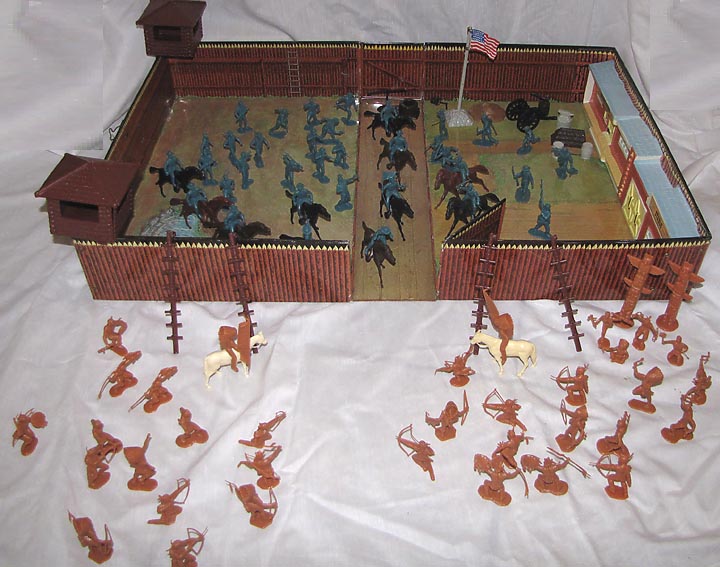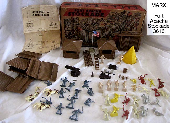 SORRY SOLD - Marx 3616 Fort Apache Stockade playset MISSING TIN CABIN, has complete HP stockade with two six piece guard towers and intact gate. Four ladders have usual hook damage. Has the HP set of six famous Americans; sitting Bull, Custer, Buffalo Bill & Daniel Boone are all mint, Crockett has a broken rifle but there for you to repair. Kit Carson has a broken and missing gun barrel. Complete 12 figure set of 60mm cavalry, 2 six figure sets of stockade Indians + one eight figure set of skinny Indians (Kneeling bow shooter missing feather, wounded man missing arrow). Normal cannon replaced by Marx due to shortage with space cannon. Has flag and some HP accessories. Three horses with riding saddles & reins but two are missing tails and a hoof. Teepee missing top piece. Has instructions and real nice box with dividers.