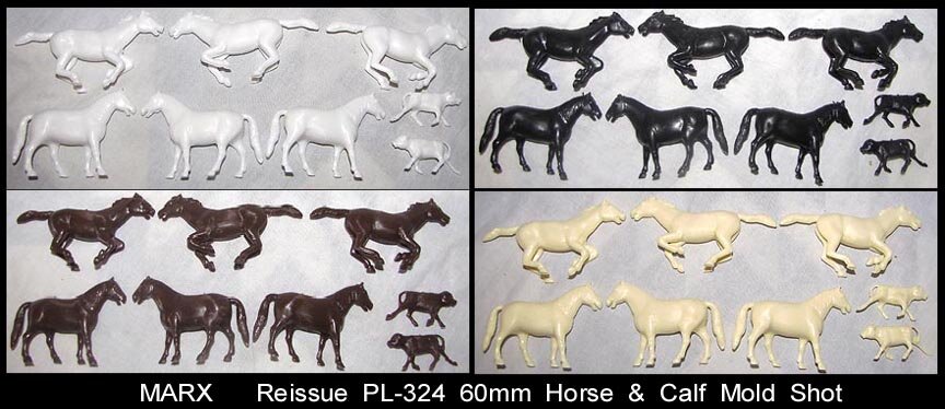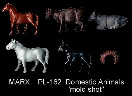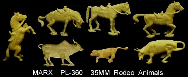 Marx made Roy Rogers playset figures in both 60mm (older) and 54mm scales. The earliest 60mm figures are made of a rubber like vinyl and do not have bases. There were two foot and one mounted pose of Roy made in 60mm. The two 60mm foot Roys and the 60mm Pat Brady are harder to find as they were not included in every playset. The 54mm figures were later and not made in nearly the amount as the 60mm figures. The 54mm Dale Evans, Pat Brady, and Bullet have their names under their bases (belly) while none of the 60mm figures are marked.
