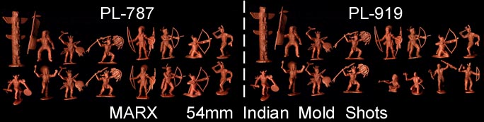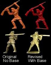 With the exception of the "odd pose" the other 12 Indian poses seen above made up the early sets. Later sets also had the "odd pose", man holding scalp and tomahawk. We do not know if this meant an earlier pose was deleted or if the mold was altered. Also the man kneeling was supposed to be using a paddle, but Marx decided to remove the paddle to avoid putting a canoe in every set. Some early examples sometimes have part of the paddle shaft as seen above. Without the paddle he becomes a drummer using one of the small accessory sprue pieces.