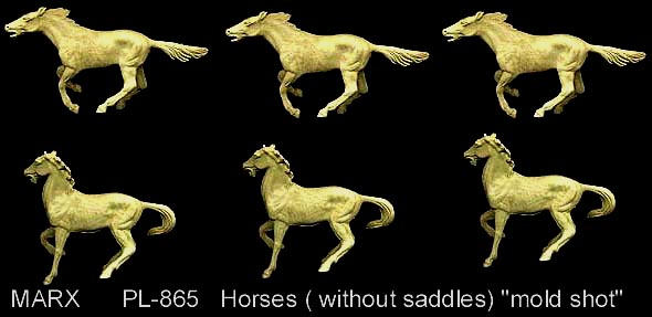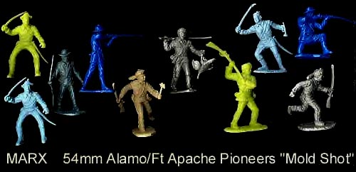 Some of the poses are copies of Marx figures which added to the speculation that they were made by Marx. We do not know who made them but we do know it was not Marx. There are nine different figures in the set. They are about 54mm in size and were made in white and cream colors.