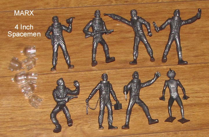 Six of the seven (except crawling pose) were included in the Generic "Rex Mars" mold. The big ears and face mask poses were also found in the Space Patrol mold, and the big ears and crawling poses were in the Tom Corbet mold. So the crawling figure seems hardest to find and the big ears figure the most common. Soft Plastic (polyethylene) figures have bases while earlier rubber like vinyl can be found with and without bases.