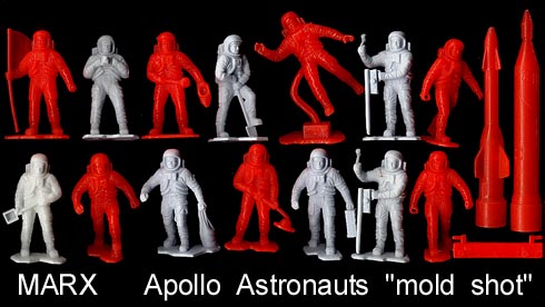 The Apollo astronauts are also called the "60mm" astronauts although they are more like 58mm in scale. They were made in white and bright orange. The mold PL-1503 had 34 cavities making two "sets" of 17 pieces as seen above. There were two different rockets, a small thin box and 14 figures in 12 poses in each "set". One duplicate was the man walking with ring hand as it took two of this pose to "carry" the thin box. Based on what we have seen the other duplicate is the figure with the hammer. As the mold made two sets the second duplicate could be different between the two 17 piece sets. This was the last playset figure mold Marx made and these figures were not put into playsets as complete 17 piece sets so it is difficult to determine the mold contents. Six of the poses were also made (PL-1500) in the 6 inch scale, usually in white.