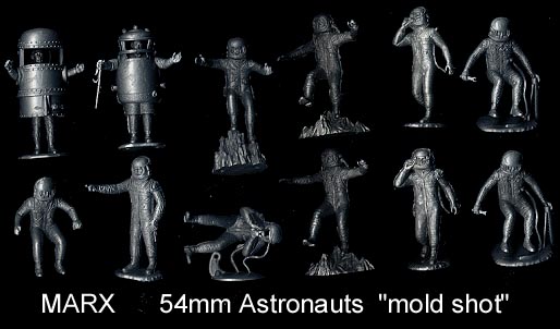 This mold contained 20 cavities and has the figures known as "Rex Mars" or "generic" space figures. There were two of the figure "floating in space", and one each of the other 12 humans and 6 aliens/robots. Playsets would have multiples of this grouping depending upon size. Most of these figures exist with and without bases (the mold was altered). In early sets they were usually made in blue or yellow rubber like vinyl. In later years they were made of soft plastic in blue, silver, cream, metallic blue and a variety of other colors. Metallic blue and cream figures were used in Cape Canaveral