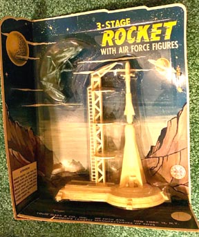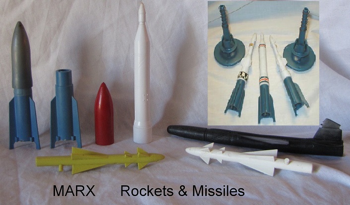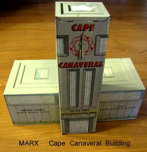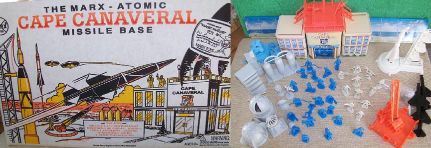 Reissue Marx Cape Canaveral playset were made in the late 1990s. More stuff than is in the picture. Three sets of 45mm airforce figures (60-66 total), bag of construction workers, two white rocket launchers with multi-piece rockets, one orange rocket launcher with 3 black rockets (NO rubber tips, 3 blue saucer launchers, gray accessories, tin building and wall with plastic top piece, decals and instruction sheet. Great Christmas present.