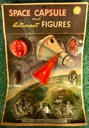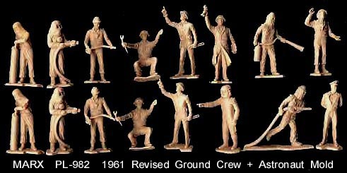 This mold was made in 1961. PL-1120 had 16 cavities that included two different 2pc "bell" suits + 12 figures in 9 poses with three of the poses in duplicate. The seated figure was also used in the space capsule mold (PL-1119) and the pointing astronaut was put into the revised ground crew mold about 1961.