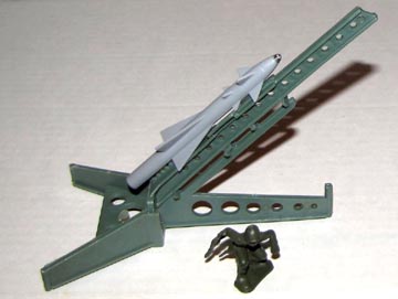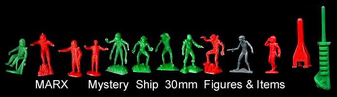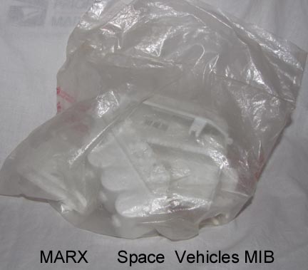 Marx reissue Space Ranger items; Fourteen 30/35mm Figures (8 astronauts & 6 aliens) + three rockets with launcher (no spring)+ two other items (I am not sure of their use). A mix of off whites & grays. Pretty much the same figures as the Marx Mystery ship figures except the two astronauts with big hoops on their heads. The reissue assortment varies from bag to bag.