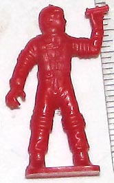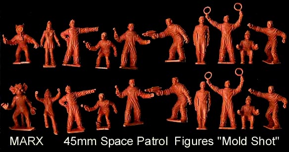 Small 1/72 scale gray copies with factory paint of Marx 45mm Space Patrol figures were made in the 1950s/60s and were sold on blister cards and perhaps in "gum ball" machines. These figures can also be found in a variety of unpainted colors.