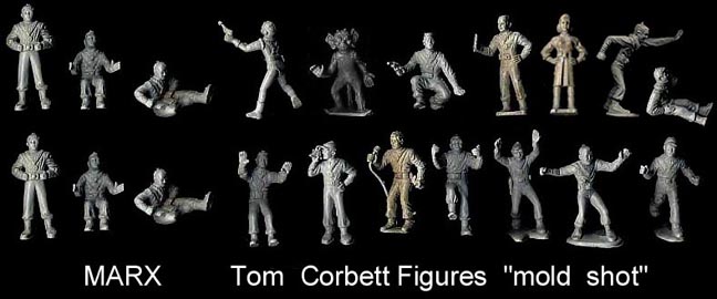 This mold had 20 cavities. It contained two each of Tom Corbett standing hands on hips, seated driver figure and figure sitting reading a book + one each of the other 12 humans and two aliens. The Tom Corbet figures were usually made in gray rubber like vinyl in earlier years and soft plastic in later years.