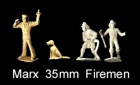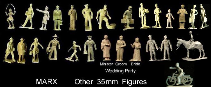 10.00 Marx RECAST PL-1130 (we think) Store People; 24 35mm Figures + dolly in blue or gray. The first five in the top row are not airport figures so we think Marx borrowed the other poses from their airport figure mold and added them to these new five poses to make their store people. We would have replaced the man with batons with the newsboy. (3 GRAY IN STOCK)