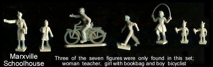 The Marxville school house came with seven figures. The woman teacher, girl carrying book bag and boy on the bicycle were only made for this set. See above for availability.