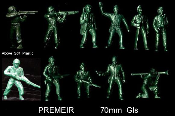 We believe the above 70mm hard plastic GIs to have been made by Premier (thanks to Bob Jones for unearthing them). They look very similar in style and sculpture to the girls seen above. Light green figure photo courtesy Robert Damiano. Also made in Army green, metallic green & silver.