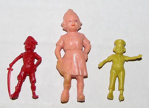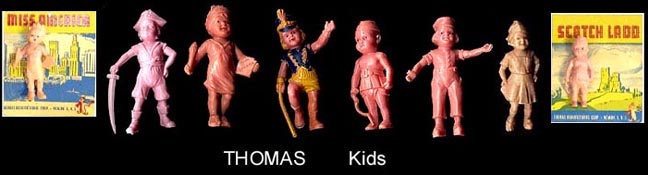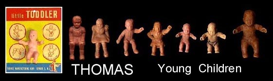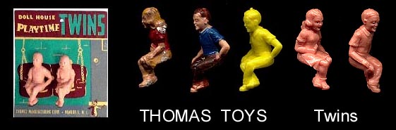 Thomas used a variety of figures in their doll houses and blister card sets. They are usually found in rubber like vinyl and can be very rubbery. The smaller one inch baby was the first soft plastic figure sold in the united states in 1947.