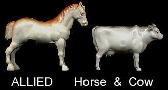 Another small maker from the 1950s who made small vehicles and these farm animals. Animals have the Allied logo on their sides in a circle but often it was not molded completely and is unreadable. Perhaps copying Auburn they painted the top of the backs of the horses and cows. Animals are hollow and were made in two pieces and glued together. See Caldwell below for more Allied info.