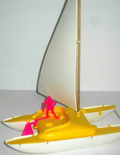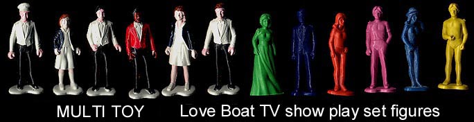 In 1983 Multi Toys sold a playset based upon the the popular 1980s TV show "The Love Boat". It came with the figures seen above, the first six are hard plastic, factory painted and represent the ship's crew. They were the regular cast led by Gavin Macleod as the Captain Stubing. The single colored figures represent the weekly guest stars who usually had some travail but eventually found love aboard the boat by the end of each weeks show. They have three dress styles; formal, casual & bathing suits. Figures are about 50mm in size. Characters are marked under their bases; "C 1983, Aaron Spelling Prod. Inc". All figures are marked "MTC" on their backs which we assume stands for the Multi Toys Inc.