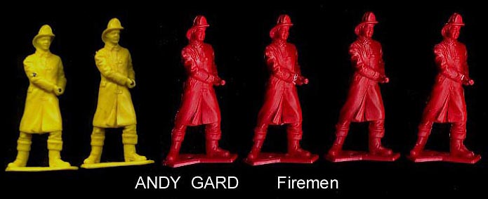 Andy Gard made a fireman to accompany their Fire trucks. It looks to be based upon an Auburn figure. We have seen examples with the helmet badge numbered; 1-9. There may be two poses as the recast figures picture are holding a nozzle while the vintage yellow figures are ring hands to accept a separate nozzle or hose. Or the cavity may have be revised.