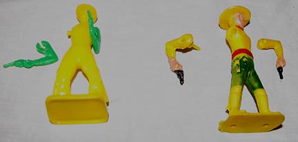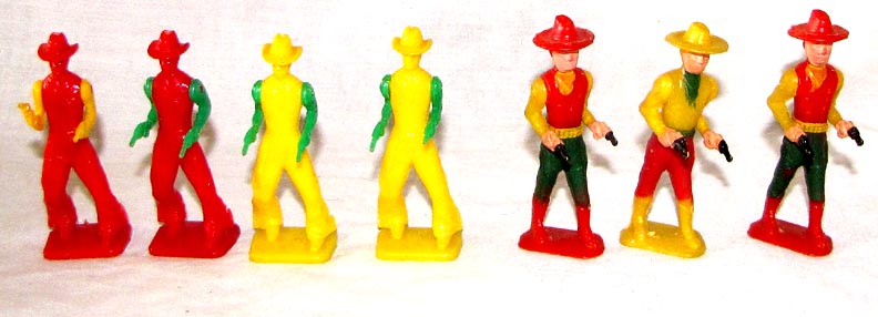 In the early 1950s, Ausley made hard plastic cowboys with clip on swivel arms. They come unpainted and have rectangular bases marked AUSLEY. Larger figures have also been found and we are unsure if they were also made by Ausley. These figures have an arm assembly that plugs together that also swivels. They come factory painted and have more oval bases with no markings, but with only two mold ejector pusher pin holes