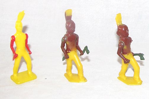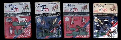 These large 5 to 6 inch figures were produced for the 1976 bicentennial celebration. They were sold in header card bags and individually as "bin" toys. They were made of a slightly stiffer plastic than polyethylene, perhaps polypropylene and can be damaged. Original colors were; blue, red & yellow but some were also made in a nice tan.