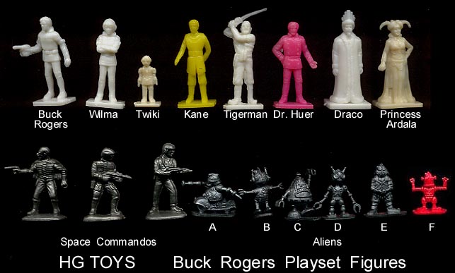 In 1979 HG came out with a Buck Rogers playset. Human figures are about 40mm in scale while the robot aliens are smaller.