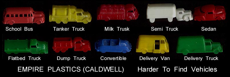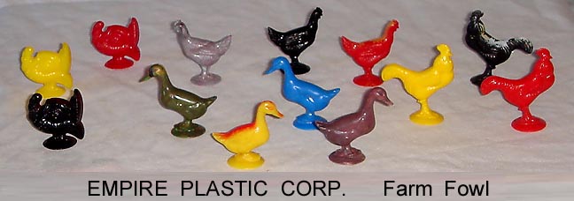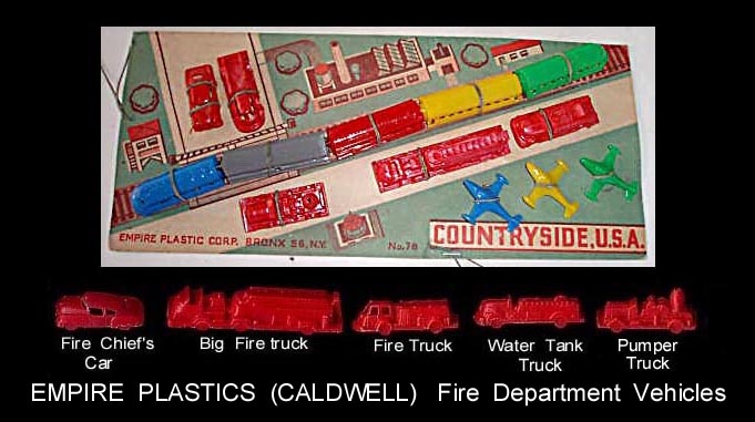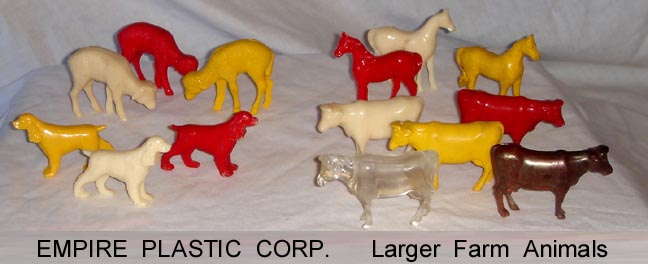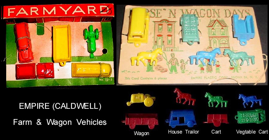 In 1946 Caldwell Molding started up in Canada. By 1948 they had moved to the Bronx in NYC and then to nearby Pelham Manor around 1955. They made molds for others and also for themselves with their primary business of making plastic buttons for clothing. They also started making molds that made small toys. They set up a subsidiary, Empire Plastic (New York is the "Empire state) to sell the toys they were making. They made all sorts of small vehicles as well as farm animals. They made the mold making the hollow belly animals Ohio Art used in their farm playsets. In 1960 they were sold to Carolina's Enterprises and moved to the Raleigh Durham area (Tarboro) of North Carolina. There they made a line of 3 inch jointed western figures sold on blister cards that competed with Marx's similar line. They also started making blow molded Halloween and Christmas decorations that would light up and be used inside or out. In 1976 for the Centennial they made a set of six inch figures. There were 8 figures, 5 colonials and 3 Indians. A few years later they made the four space figures during the Star Wars craze. When Marx went out of business in 1979 they bought the tooling to make the "Big Wheel" tricycle but it seems the toy range was phased put in the 80s. They became part General Foam Dynamics in the 1980s who went out of business in the late 1990s.