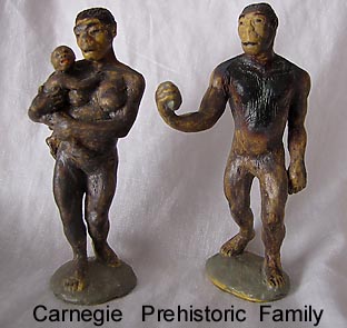 Prehistoric family as seen above. Both figures marked 1988 The Carnegie Safari LTD Miami FL, Australpithecus 1.4 meters Made in China. Man also marked MALE & woman FEMALE. Made of a rubbery plastic and about four inches tall.