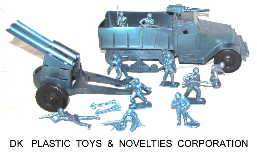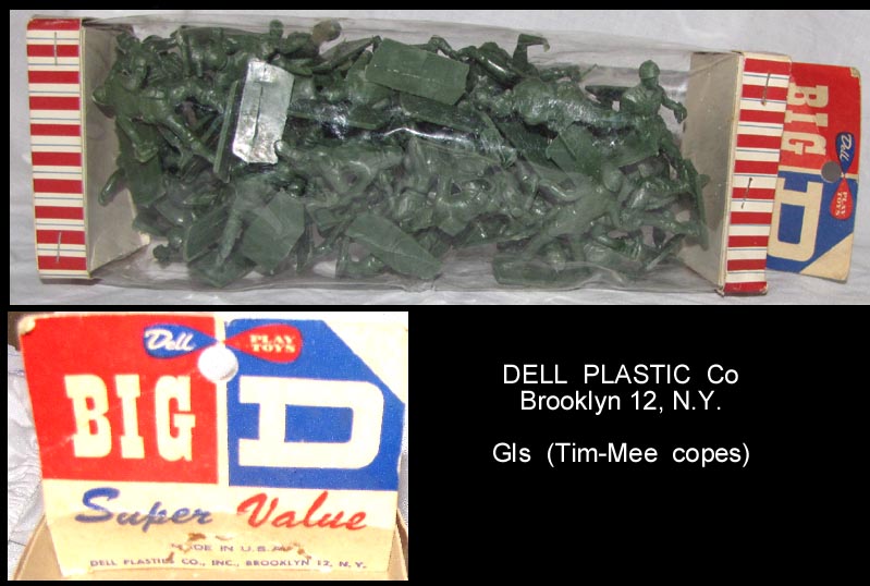 The Plastic Toys and Novelties Corporation made copies of the Tim-Mee 60mm GIs in Metallic blue and army green. These were misidentified as having been made by Eldon in the Geppert Guide.