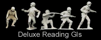 About 1981 Helm Toy copied (in Hong Kong) some of the Marx German and American poses (barbwire, small cannon, six Germans & the first three GIs in the picture) and three Deluxe Reading poses (Three GIs on right in picture) to put in their own sets. These are not found very often. They are a bit smaller than the Marx originals (probably pantographed) and each base is usually marked "HELM TOY HONG KONG".