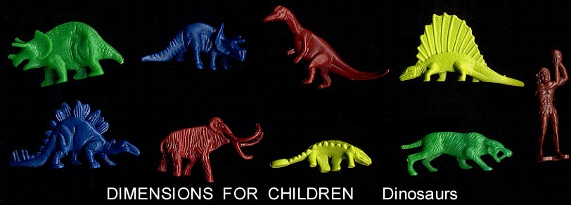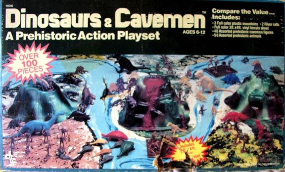 In the early 1980s DFC made a series of playsets. The prehistoric set came with a heavy vinyl playmat, three vacuform "mountains", cardboard raft and a nice series of 45mm cavemen compatible with Marx, a series of smaller animals mostly copied from Processed Plastic (Tim-Mee) and a double set (12 animals) of copies of Sinclair dinosaurs. The Sinclair dinosaur mold was made in 1964 for the Sinclair Oil Company who sold bagged sets of these dinosaurs at the 1964 World's Fair. The "Sinclair" dinosaurs are also compatible in scale with Marx. All in all a nice set if you can find one.