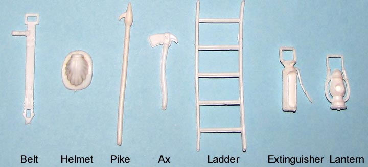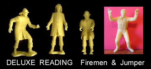 The firemen on foot pictured below were sold with firetrucks made by Deluxe Reading and Eldon. Obviously based upon the MPC ring hands the actual maker is unknown. The white accessories are very similar to the ones made by MPC and the ones pictured below came with a Deluxe Reading firetruck but we can't be totally sure some were not made by MPC. The Deluxe Reading fire truck drivers are silver and have clip on red helmets. The Eldon drivers were also made in a silver color but their helmets are molded onto the heads. Foot pegs for Deluxe Reading truck attachment are often missing or short.