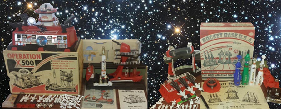 We know of at least 11 human figure poses made for the Deluxe Reading rocket base playsets. Not included in the above photo is the Astronaut in seat for one of the space capsules. Also made to ride in one of the three space capsules were a dog and a monkey. The third capsule held equipment.