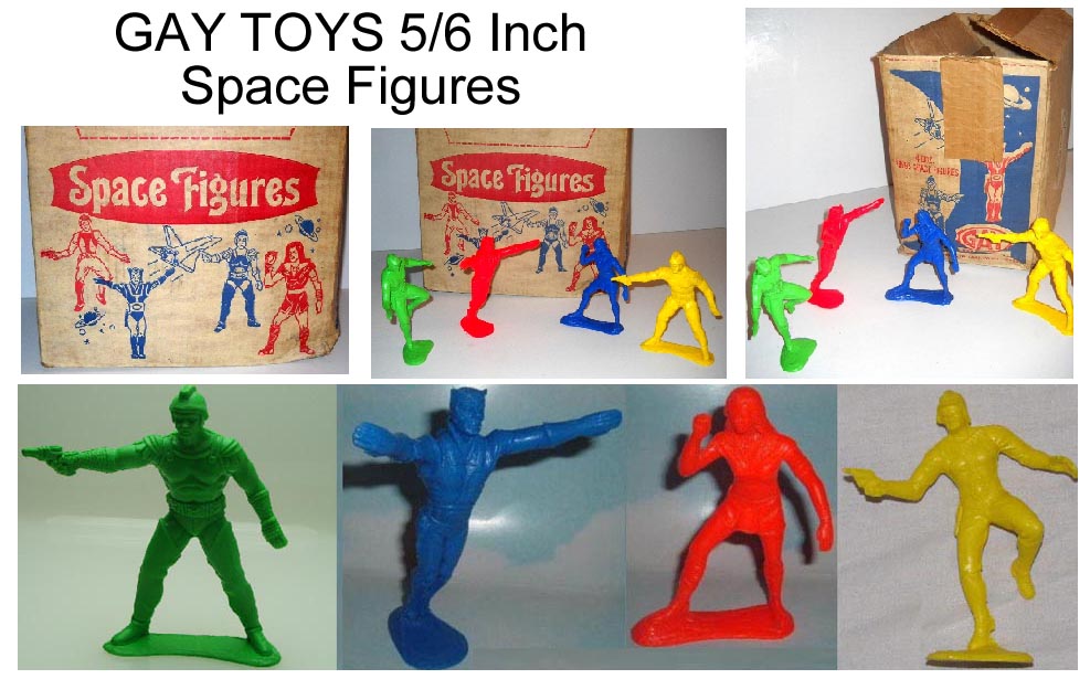 Once thought to be made by Empire Plastic the box in the picture above is marked Gay Toys. Gay Toys briefly made four large 5 to 6 inch scale space figures. Probably in the late 1970s when Star Wars and Buck Rogers were popular. Photo of two figures in the center courtesy Rick Koch.