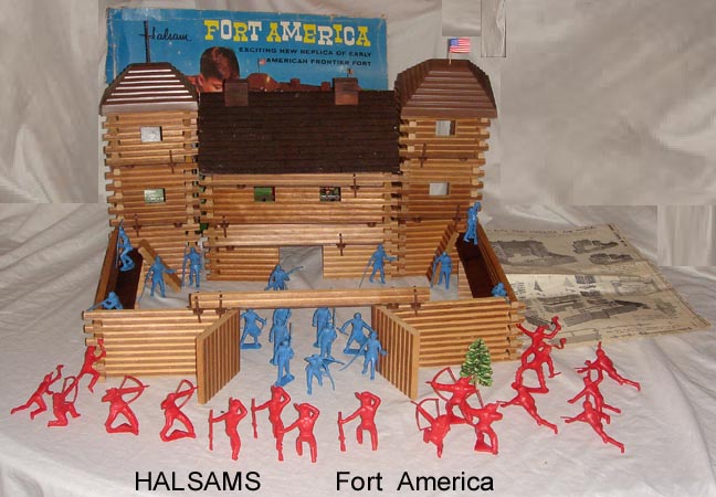 Halsams is primarily known for their domino sets, American Bricks and American logs sets. In the early to mid 1960s they made a wooden fort playset "FORT AMERICA" Earlier sets will have Lido figures (as shown on the box) but as Lido went out of business in 1964 Halsams at some point switched to Tim-Mee Toys for figure supply (box lid stayed the same showing Lido figures). Although we have see a few sets with Lido figures they usually have the Tim-Mee ones.