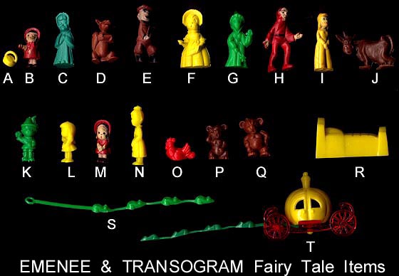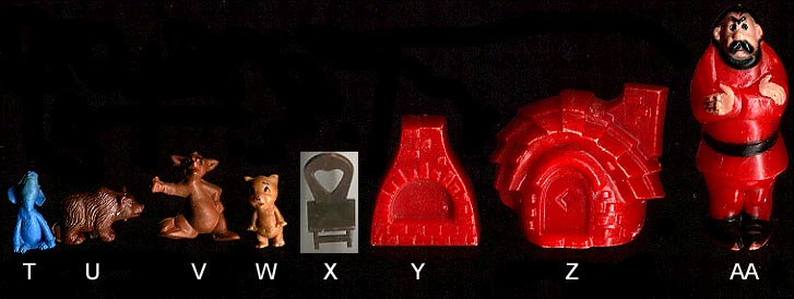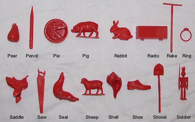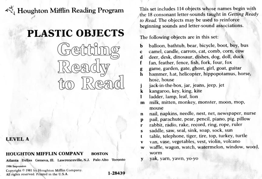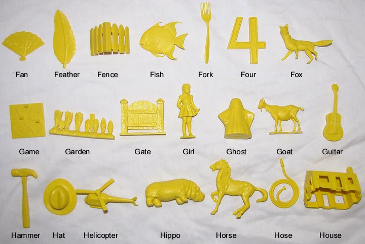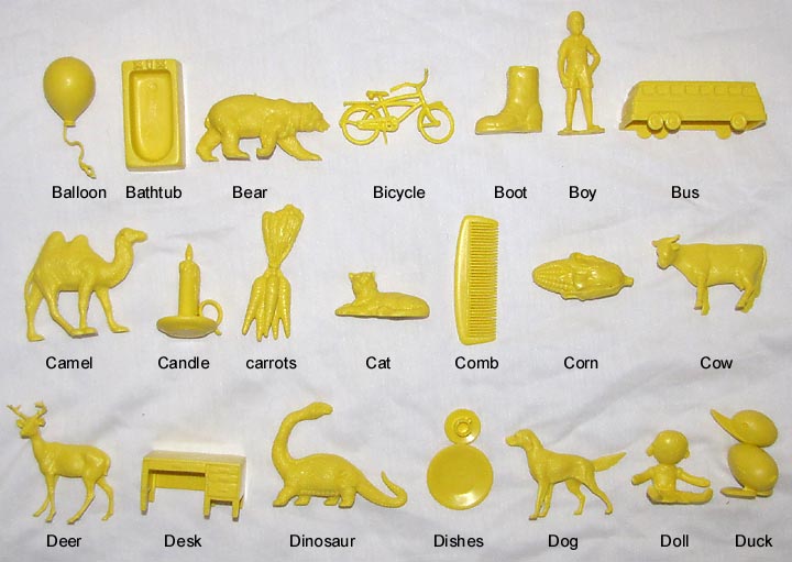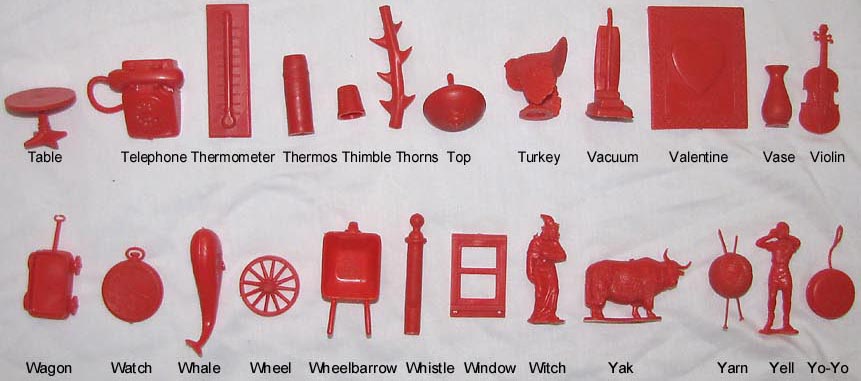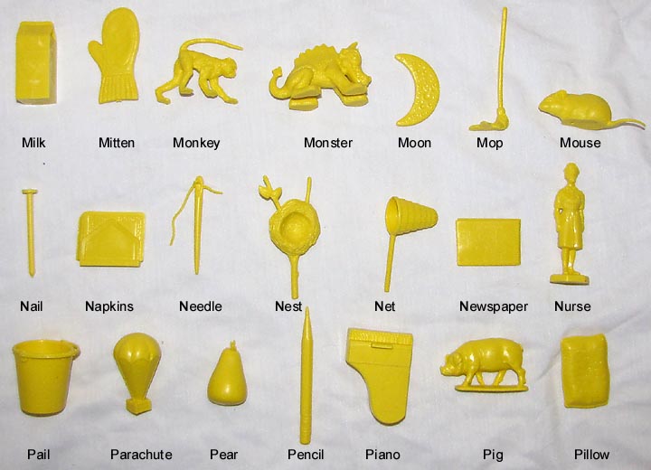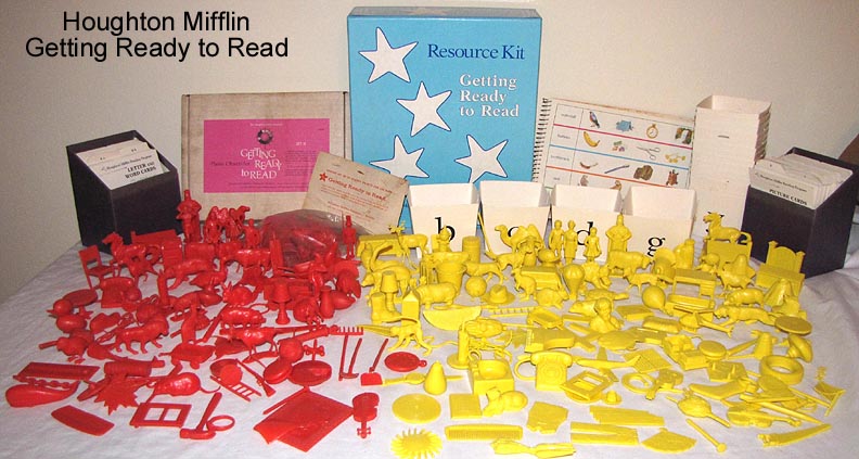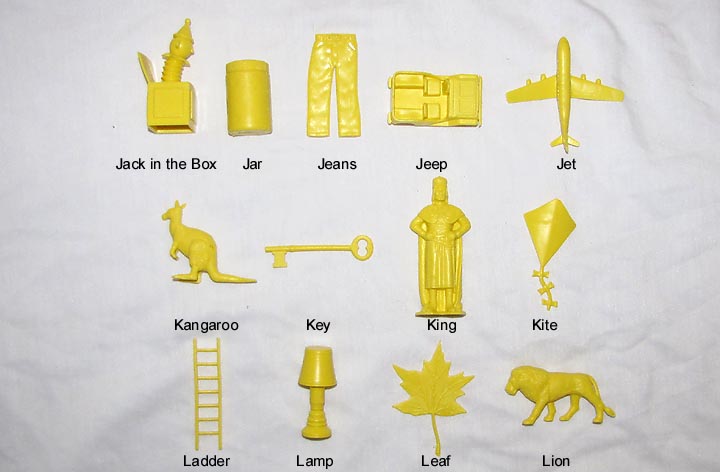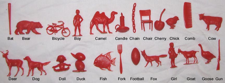 After the Russian Sputnik was launched powers that be panicked and went around trying new ways to give children a better education. Houghton Mifflin along with a group of college professors developed these plastic objects to be used with a Kindergarten program "Getting Ready To Read" to help children learn consonants. Developed in the mid 1960s the 88 objects were first made in red. In 1981 the set was revised, enlarged and the now 114 plastic objects switched from being made in red to yellow.
