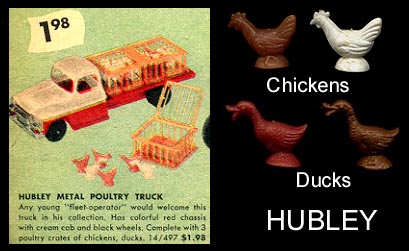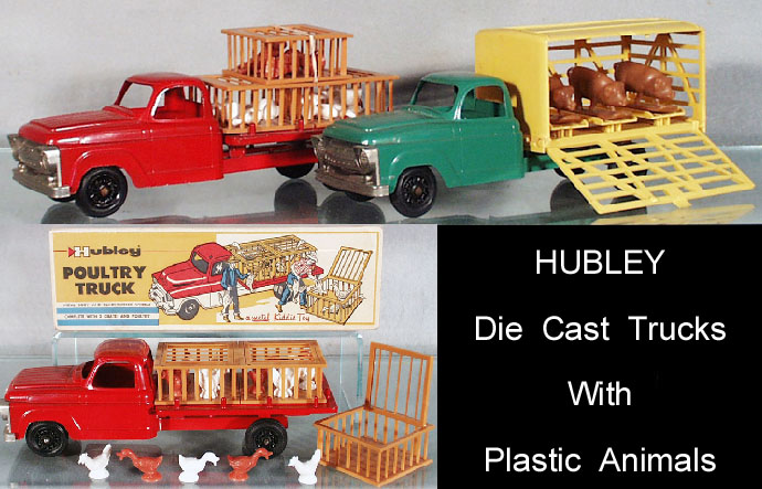 Hubley made a nice metal poutry and swine farm trucks as seen in the 1957 catalog ad. The crates and pigs are hard plastic, the fowl soft plastic.