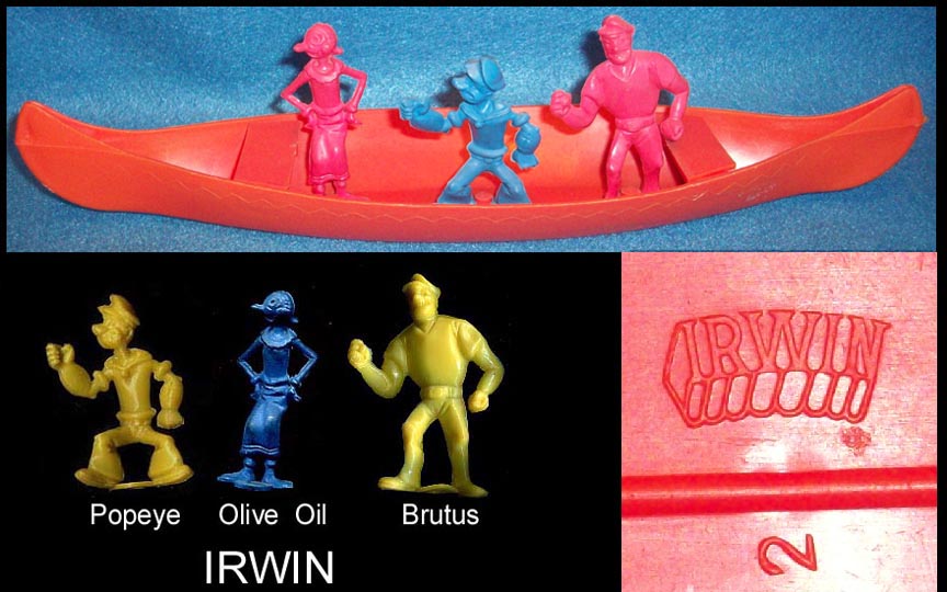 These Popeye figures were not made by MPC, but by Irwin Due to the hole in their bases it had been assumed they were made by MPC. Marked K.F.S. (Kings Feature Syndicate)owners of the Popeye copyright. 1/32 in scale. Jim McGough provided pictures of the figures in a canoe clearly marked Irwin. See the ALL OTHER USA MADE A-O page for availability