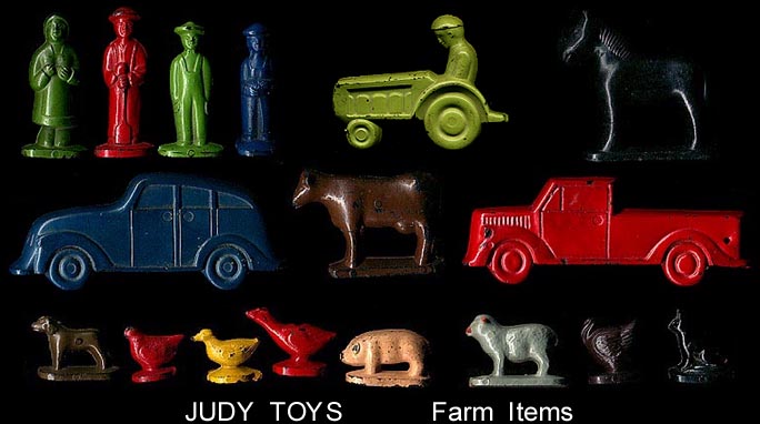 In the mid to late 1940s Judy Toys made a series of Farm sets. The people, vehicles and animals are made of a bakelite type of dense hard rock like plastic. The vehicles are almost 2-D. Most items are painted in one color. Farm buildings in the playsets are made of a heavy cardstock/cardboard.